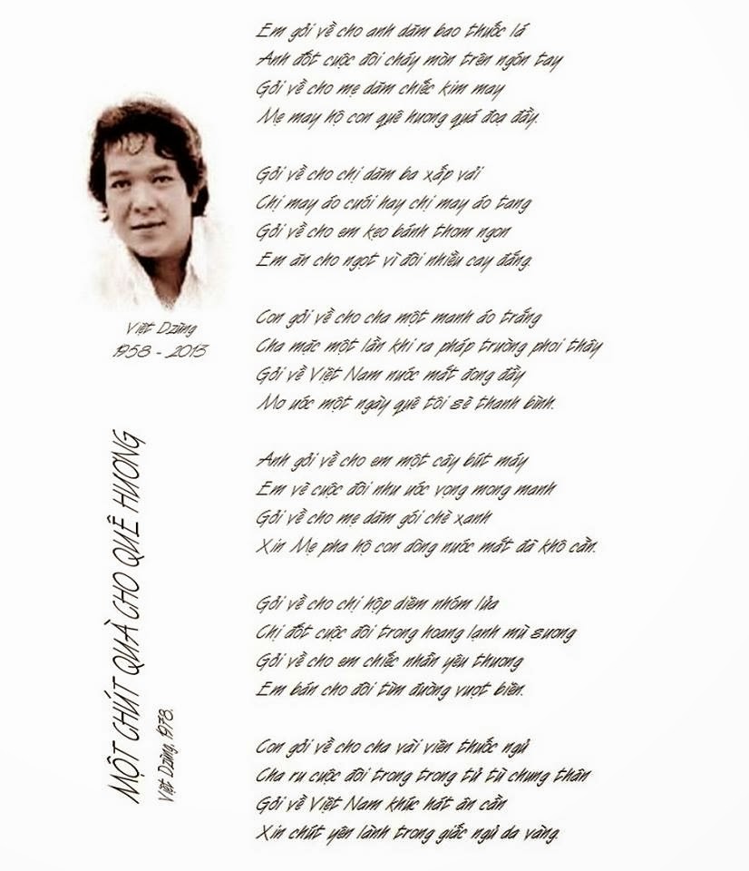“Gửi về Việt Nam nước mắt đong đầy…”(Việt Dzũng) . Thời tiết mấy tháng nay tại Úc Châu, đang là mùa Hè nhưng nắng mưa, nóng lạnh thay đổi bất chợt, từ nạn cháy rừng đến giông bão chuyển ập đến. Từ khuya thứ Bảy, 21.12.2013, ngoài trời lại chuyễn mưa, điện thoại từ Mỹ gọi sang báo tin cho tôi biết Việt Dzũng đã không còn nữa !. Nhìn qua khung cửa trong đêm vắng lạnh chợt đến, lạnh từ không gian đến tâm hồn cô đơn, những giọt mưa lất phất như tiếng hát của Việt Dzũng vọng về từ cõi mơ hồ nào đó trong bài “Một chút quà cho Quê Hương” với nước mắt đong đầy…nước mắt của Việt Dzũng thương nhớ quê xưa và nước mắt của riêng tôi khi mất thêm một người em, một chiến hữu, trên hành trình còn dang dở một đời tâm nguyện. Em đi đâu rồi, hay vẫn còn đang đứng trước mặt anh với đôi nạng gỗ, thênh thang giữa đất trời, mưa bay… ?