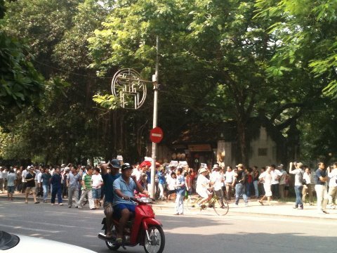 08h42: Những người biểu tình tập trung rất đông tại chân tượng đài Lý Thái tổ và hè đường đối diện. Tuy nhiên, lực lượng an ninh khá cứng rắn khiến cho mọi người vẫn khá tản mát.