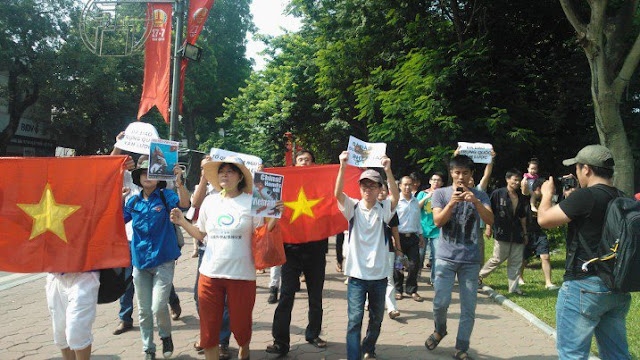 09h12: Đoàn biểu tình hăm hở đi ngang đền Ngọc Sơn, nhưng công an dồn đến quyết liệt đưa khoảng 10 người lên xe bus. Mặc dù vậy, khoảng 200 người còn lại vẫn tiếp tục tuần hành.