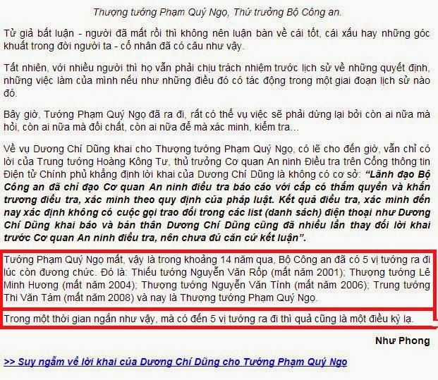 Thượng tướng công an. Thuận theo mong muốn điều tra đến cùng của nhân dân, Ban Nội Chính vào cuộc, Bộ Chính Trị sẽ quyết. Thế mà vì căn bệnh ung thư gan quái ác, nhân vật chính lại... từ trần, để lại...
