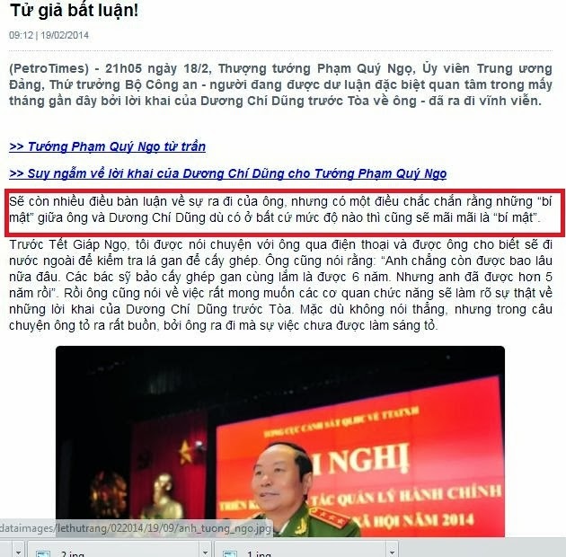 Petro Times tiếp tục làm chủ cuộc chơi khi tông ra tư liệu đặc biệt về hai cuộc gặp gỡ giữa Dương Chí Dũng và Tướng Phạm Quý Ngọ. Xin nhấn mạnh rằng báo này tỏ ra cực kỳ cao thượng khi không thèm view, traffic. Với một template lỗi - không chuẩn seo google
