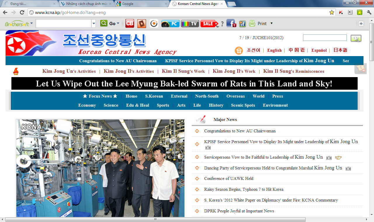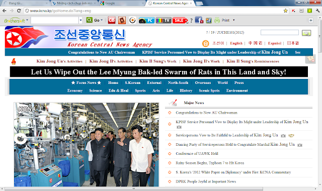 Mình ghi lại được 5 khẩu hiệu chạy trên màn hình trưa nay 19/7/2012 của KCNA nhờ bà con thẩm định mức độ dã man mông muội trong cách tuyên truyền của Bắc Triều tiên nhá