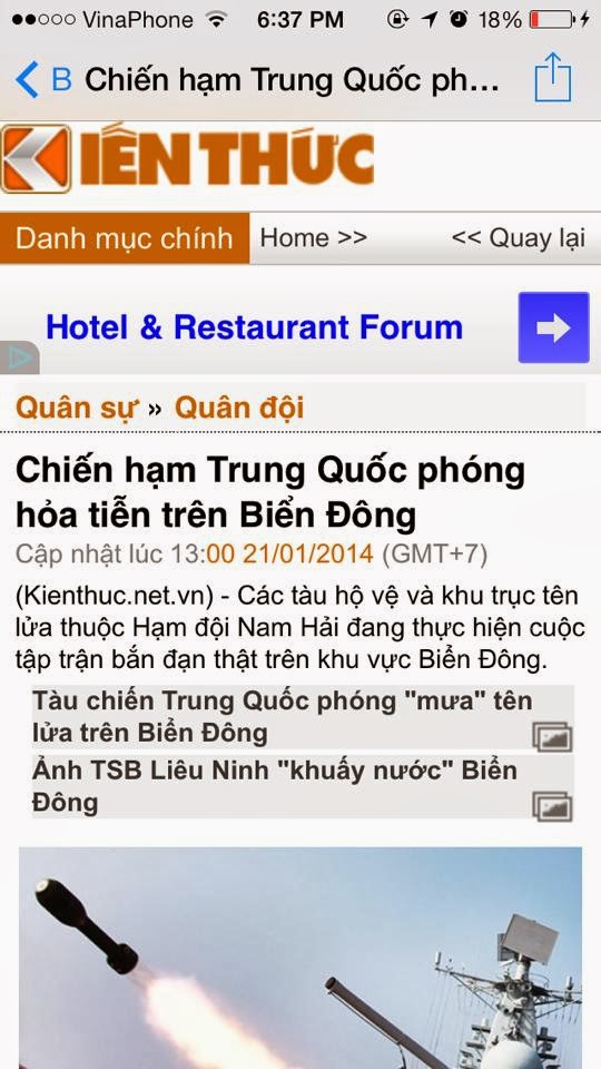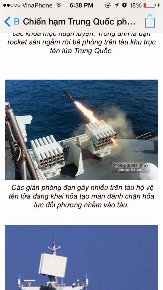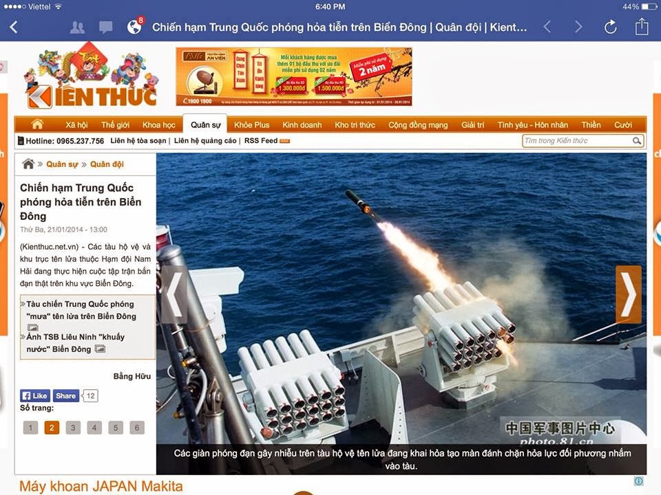 Chúng ta hãy xem tờ báo này, những hình ảnh và lời bình của một tờ báo Việt Nam về quân đội Trung Quốc. Tờ báo này hồn nhiên ca ngợi sức mạnh của quân đội TQ đang tập trận phòng thủ ở biển Đông. Thậm chí minh họa rằng quân đội Trung Quốc đang bắn tên lửa vào đối phương. Vậy đối phương của quân đội Trung Quốc là ai? Biển Đông có của Trung Quốc hay không mà Trung Quốc tập trận dưới cái tên là phòng thủ.? Báo chí tuyên truyền kiểu này hóa ra khẳng định biển Đông là của TQ, và chính TQ đang phải lo lắng phòng thủ vì sợ đối phương nào đó giành mất biển, đảo. !!!!