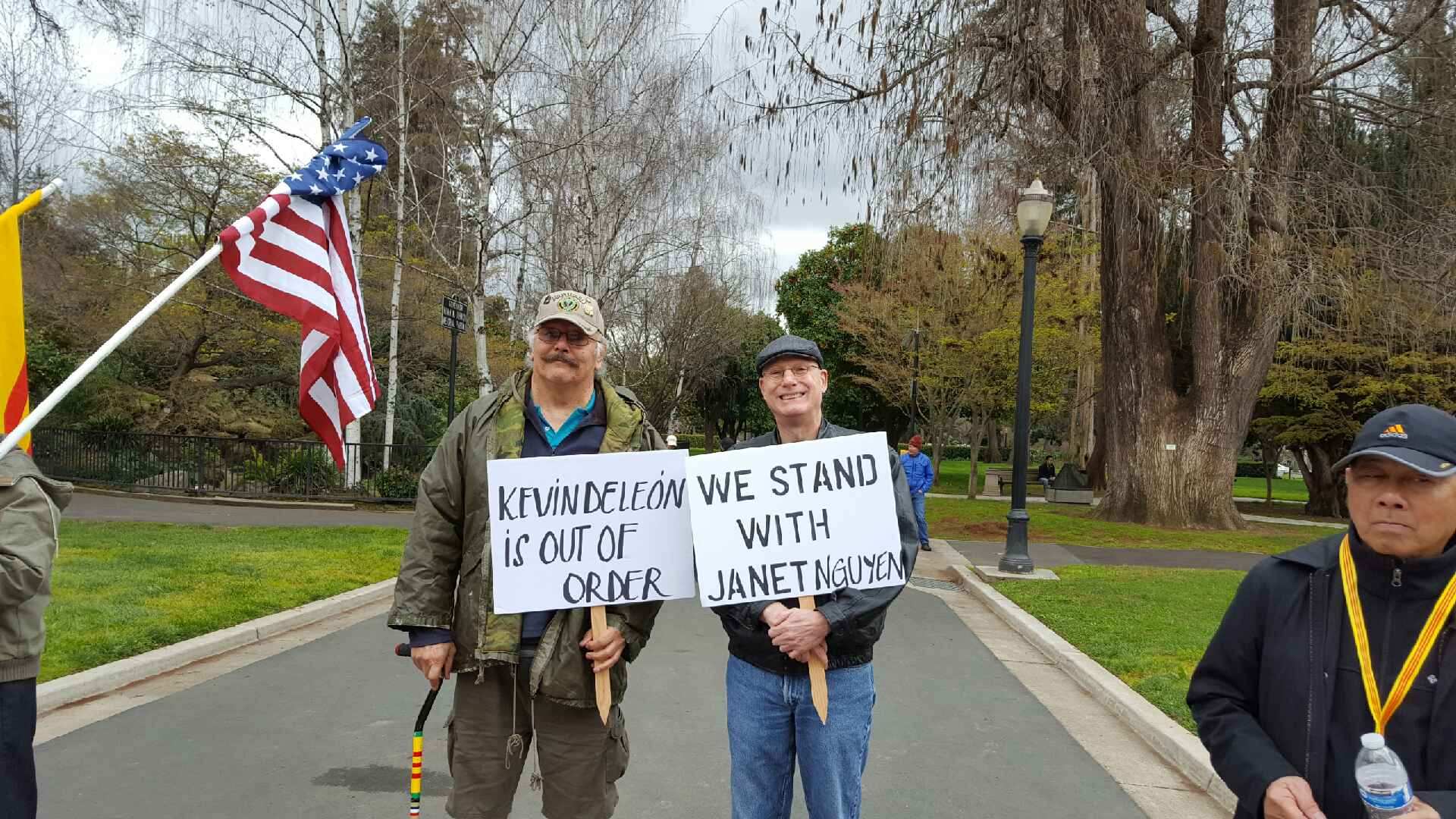 Ðồng hương và cả người bản xứ từ Fresno, San Jose, và đông nhất là tại vùng Sacramento tập trung ngay sân cỏ trước cửa văn phòng thống đốc tiểu bang California giương cao cờ Hoa Kỳ, cờ vàng VNCH, cùng các biểu ngữ thể hiện sự ủng hộ TNS Janet và phản đối hành động được xem là “bịt miệng tự do ngôn luận” của TNS Ricardo Lara khi yêu cầu đưa TNS Janet ra khỏi phiên họp khoáng đại tại Quốc Hội hôm 23 Tháng Hai.