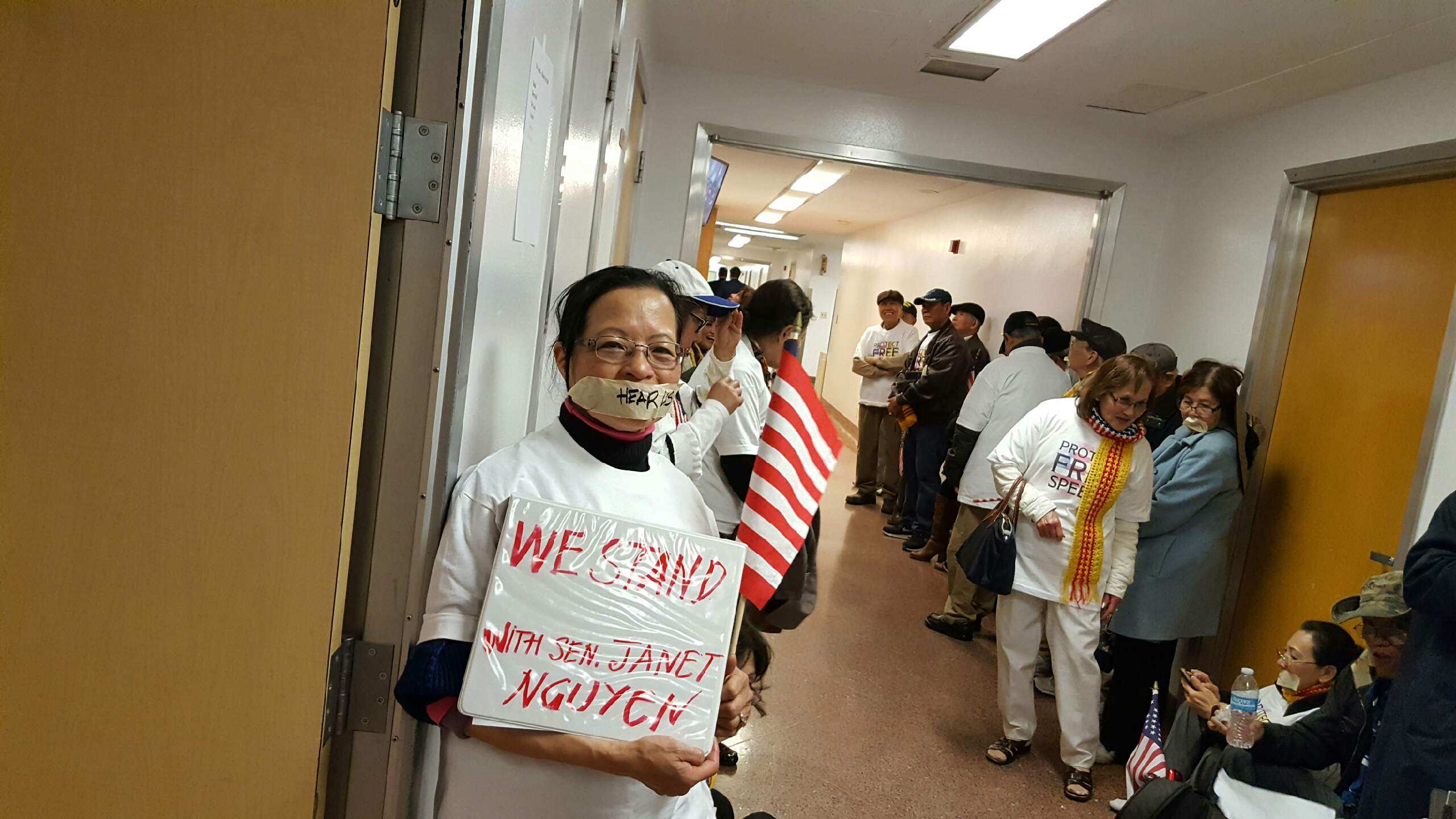 Thượng nghị sĩ Janet Nguyễn lên tiếng phản đối bị miệng tự do ngôn luận. Ngay sau đó bà đã bị ngừng phát biểu và "đuổi khéo" ra khỏi phòng họp. Người dân biểu tình ủng hộ bà Janet Nguyễn đã biểu tình trước Quốc hội California.