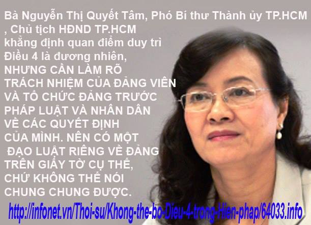 Hơn nữa, việc đổi mới phương thức lãnh đạo của Đảng cũng là vấn đề đang được tổng kết, nghiên cứu. Vì vậy, Ủy ban DTSĐHP đề nghị Quốc hội không đưa vấn đề ban hành luật về Đảng vào Dự thảo Hiến pháp." http://www.tienphong.vn/xa-hoi/627949/Khong-doi-ten-nuoc-khong-ban-hanh-luat-ve-Dang-tpov.html