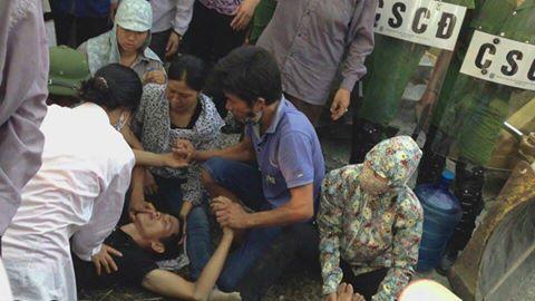 | Một bác nông dân bị đánh, bà con trong làng đang cõng bác ra xe đi bệnh viện |