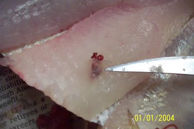 Lâu nay khi làm cá, thình thoảng mình cũng có thấy những sợi gân máu đỏ, hoặc trắng này lẫn trong thịt cá, nhưng mình " Hai Lúa " quá, không biết đó là những con giun ký sinh, cứ tưởng gân máu hay gân .. gì gì đó. Mình đã cho nó qua ải một cách dễ dàng. Bây giờ tình cờ search chuyện tôm mới biết thêm chuyện cá... Ôi thôi từ đây khi làm cá sẽ phải mở mắt thật lớn để check.