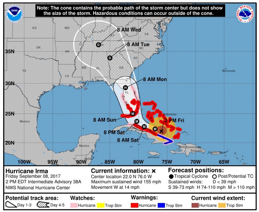 Irma đã được hạ cấp xuống từ Loại 5 sang cơn bão Loại 4 vào sáng thứ Sáu. Tính đến 11:00 giờ miền Đông, tâm cơn bão đang di chuyển di chuyển 14 mph và đang nằm ở 405 dặm về phía đông nam của Miami.