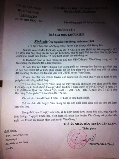 Ngày 3-8-2012 Tòa án nhân dân huyện Văn Giang đã gửi trả đơn của các hộ dân khiếu kiện kiện bà Chủ tịch UBND huyện Văn Giang trong việc cưỡng chế đất vào các ngày 7,8,9, tháng 1 năm 2009.