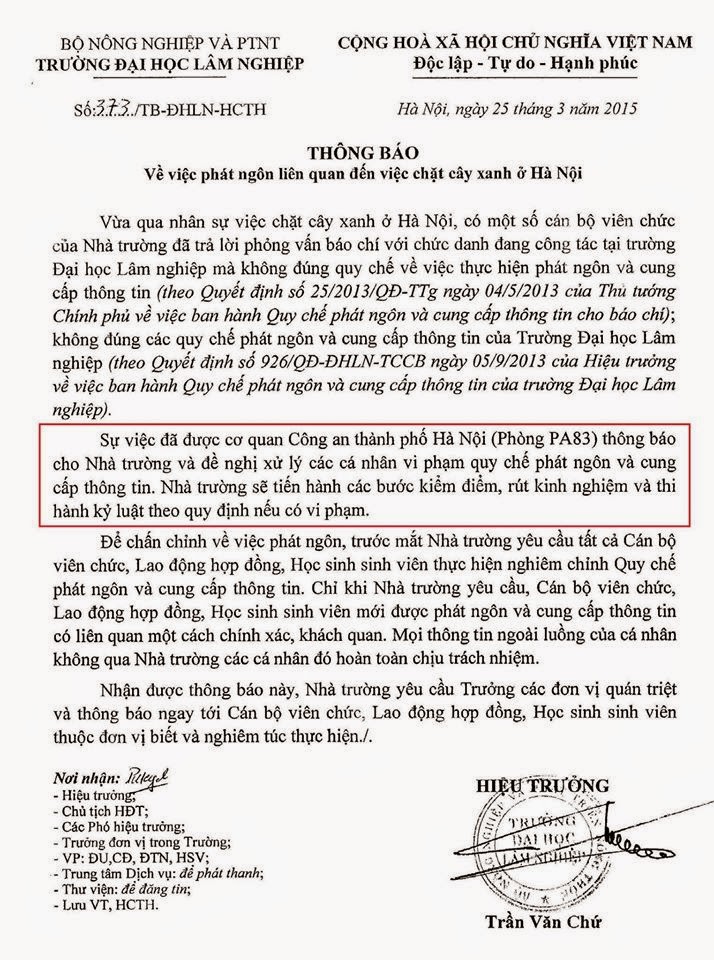 4. Liên quan đến vụ chặt cây xanh ở Hà Nội, mới đây trường đại học Lâm nghiệp ra thông báo số 337 ngày 25/3/2015 về việc phát ngôn liên quan đến cây xanh Hà Nội. Thông báo do ông hiệu trưởng ký có nêu rõ, do cơ quan công an thành phố Hà Nội (PA83) thông báo cho nhà trường và đề nghị xử lý cá nhân vi phạm quy chế phát ngôn và cung cấp thông tin. Và thông báo này cho biết sẽ tiến hành kiểm điểm, rút kinh nghiệm và kỷ luật những đối tượng vi phạm.