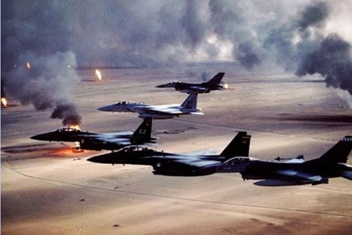 Máy bay Liên quân ném bom trong Chiến dịch Bão táp sa mạc – chứng minh sự sai lầm trong ảo tưởng của Saddam Hussein. Ảnh: Internet.