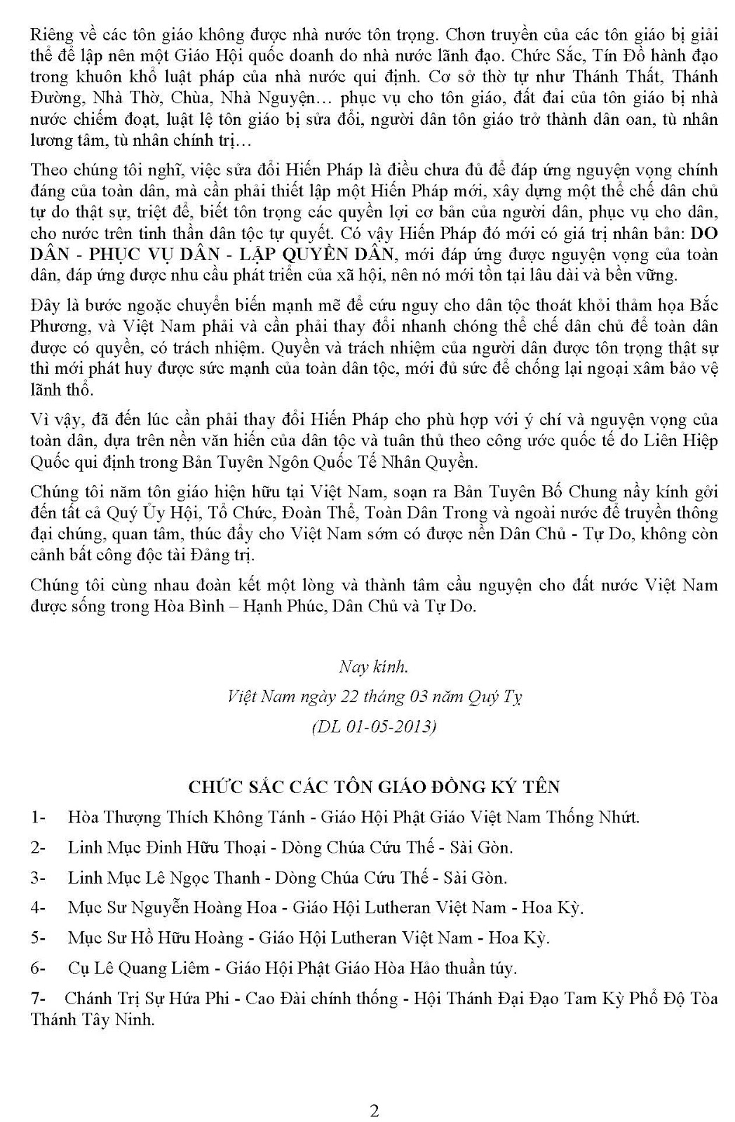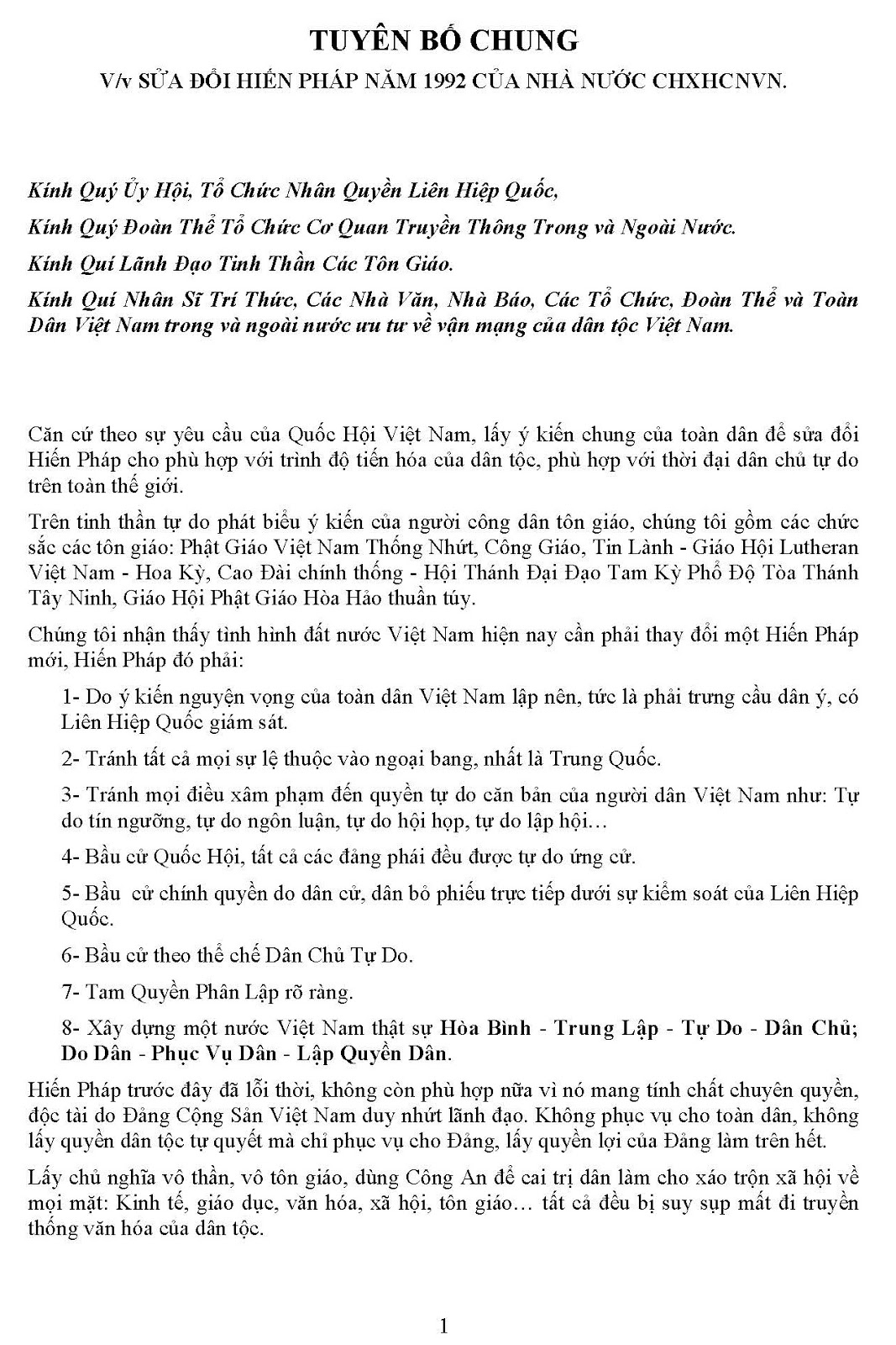 Hôm 1/5, Các chức sắc của 5 tôn giáo là Phật Giáo Việt Nam Thống Nhứt, Công Giáo, Tin Lành - Giáo Hội Lutheran Việt Nam - Hoa Kỳ, Cao Đài chính thống - Hội Thánh Đại Đạo Tam Kỳ Phổ Độ Tòa Thánh Tây Ninh, Giáo Hội Phật Giáo Hòa Hảo thuần túy đã cùng nhau ra Tuyên Bố Chung về việc sửa đổi Hiến pháp 1992.