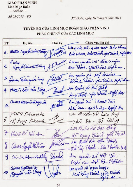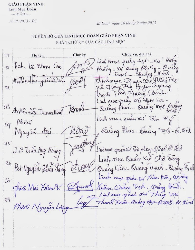"Chúng tôi – Giám mục và Linh mục đoàn Giáo phận Vinh, đại diện cho hơn 526.000 giáo dân đang sống và làm việc tại 3 tỉnh Nghệ An, Hà Tĩnh và Quảng Bình – theo dõi cách hành xử của chính quyền tỉnh Nghệ An về vấn đề tôn giáo và nhân quyền trong thời gian qua, đặc biệt qua vụ đàn áp tại giáo xứ Mỹ Yên, tuyên bố:
