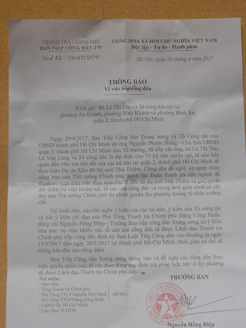 Sau 1 tuần biểu tình tại Hà Nội, dân oan Thủ Thiêm nhận được Thông Báo số: 242/TB-BTCDTW ngày 29/04/2017. Có hình chụp kèm theo.