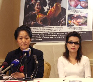 Tiến sĩ Wenyi Wang (bên trái) và Annie - vợ của một học viên Pháp Luân Công bị mổ sống để lấy nội tạng. trong một buổi họp báo tố cáo tội ác của chính quyền TQ. Phía sau là hình ảnh những học viên Pháp Luân Công đã chết vì bị mổ cắp nội tạng.