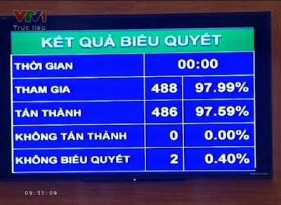 "Đồng thuận" trong Quốc hội cao như thế này không chứng tỏ Đảng được lòng dân, mà chỉ chứng tỏ Đảng độc tài thôi.