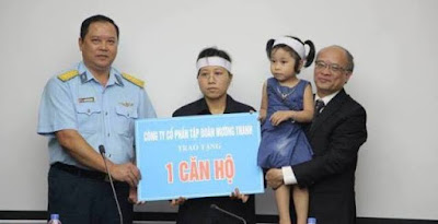 Công ty xây dựng Mường Thanh của quân đội tặng căn nhà, chìa tấm bảng bìa to ra, chụp ảnh, đăng báo.
