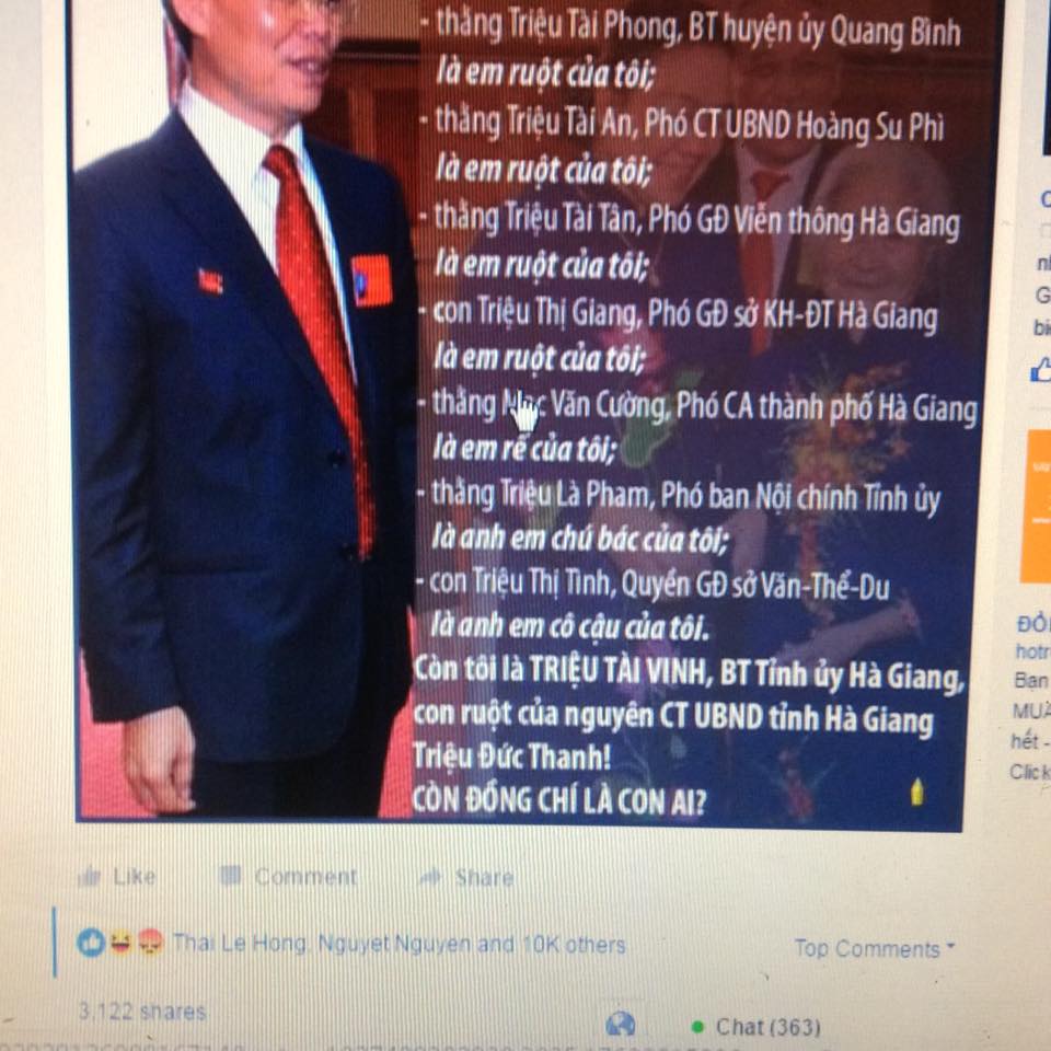 | Hình ảnh nầy đưa lên FB Huynh Ngoc Chenh trong 1 ngày đã có trên 10.000 người like và 3.122 lượt chia sẻ |
