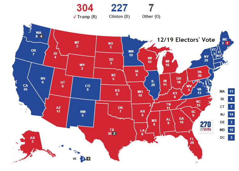 Bà Hillary Clinton bị mất đi 5 phiếu (232-5=227) vì tại TB Washington có 4 phiếu và TB Hawai có 1 phiếu không bầu cho bà, cũng không bầu cho ông Donald J. Trump mà bầu cho một người khác.