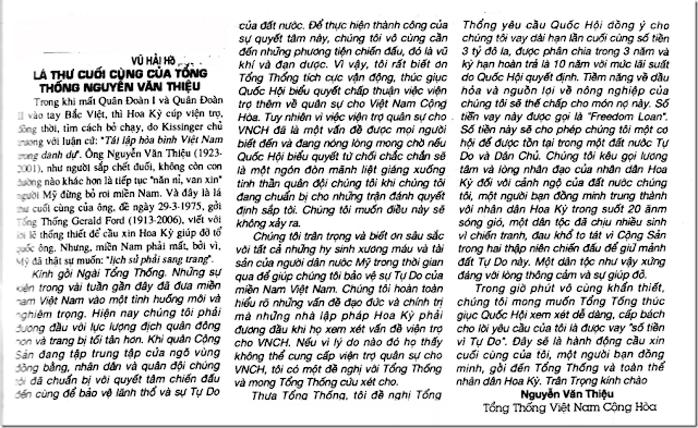 Diễn Đàn Công Nhân: LÁ THƯ CUỐI CÙNG CỦA TỔNG THỐNG NGUYỄN VĂN THIỆU : (Vũ Hải Hồ)