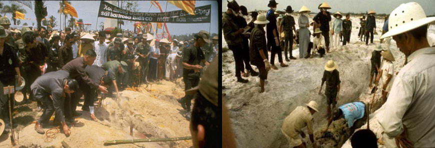 Dối trá, bịp bợm vốn là thói thường của cộng sản bởi cộng sản nghĩa là tội ác mà tội chỉ có thể được che đậy với một lời nói dối, và lời nói dối chỉ có thể được duy trì nhờ tội ác. Và phàm kẻ nào từng đem tội ra làm phương thức để đạt đến cứu cánh thì chắc chắn sẽ buộc phải lấy dối trá làm nguyên tắc. Chính vì vậy mà thế gian chẳng ai còn xa lạ gì sự dối trá của cộng sản. Dẫu vậy người Việt Nam nói chung và người dân Huế nói riêng vẫn không thể không phẫn nộ trước sự dối trá quá trắng trợn và ngang ngược của đạo diễn Lê Phong Lan và tập đoàn cộng sản Việt Nam qua bộ phim “GIẢI MÃ MẬU THÂN” hiện đang trình chiếu trên hệ thống truyền hình nhà nước để bóp méo hoàn toàn một sự thật lịch sử về tội ác của cộng sản họ đã ra tay sát hại hơn 7.000 đồng bào Huế một cách vô cùng man rợ bằng cách đập đầu và chôn sống trong biến cố Tết Mậu Thân 1968, khi cộng sản đồng lọat tấn công các đô thị miền Nam và chiếm đóng thành phố Huế trong 26 ngày đêm, mà phía cộng sản Bắc Việt gọi là “Cuộc Tổng Công Kích và Tổng Nổi Dậy Của Đồng Bào Miền Nam”. Chỉ với tên gọi cái biến cố thôi cũng đã thể hiện quá rõ bản chất bịp bợm ăn ngang nói ngược của cộng sản bởi thực tế là có cuộc tổng công kích của cộng quân bắc Việt khi Hồ Chí Minh và tập đoàn cộng sản Bắc Việt đã bội ước về lệnh hưu chiến 48 giờ để cho đồng bào hai miền được vui xuân đón tết, nhưng tuyệt nhiên không hề có “cuộc tổng nổi dậy” của nhân dân miền Nam, ngoài một số ít trí thức xuẩn động ăn cơm quốc gia thờ ma cộng sản ra, còn lại toàn thể người dân miền Nam thì kinh tỡm cộng sản như thế giới loài người từng kinh tỡm bệnh dịch hạch, bởi người dân Nam đã từng chứng kiến hơn 1.000.000 đồng bào Bắc Kỳ đã phải bỏ lại ruộng vườn, nhà cửa di cư vào Nam vào năm 1954 để lánh nạn cộng sản, cho nên không thể có chuyện đồng bào miền Nam tổng nổi dậy, và đó cũng chính là lý do mà cộng sản Bắc Việt đã trả thù nhân dân bằng cách nã đạn pháo một cách hết sức bừa bãi vào cán khu dân cư, gây thương vong cho hơn 14.000 đồng bào miền Nam, trong đó hơn 7.000 đồng bào Huế đã bị thảm sát một cách dã man mà phần lớn là chôn sống.