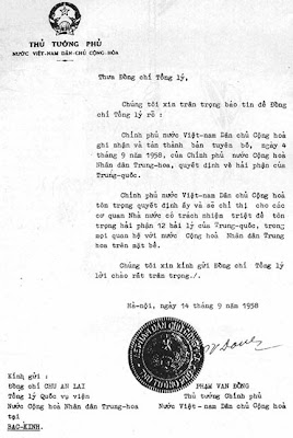 Cũng cần nhắc lại rằng Ngày 15 tháng 6 năm 1956, hai tuần lễ sau khi Việt Nam Cộng Hoà (RVN) tái xác nhận chủ quyền của Việt Nam trên quần đảo Trường Sa, thì tại Bắc Việt, Thứ trưởng Ngoại giao của Việt Nam Dân Chủ Cộng Hoà (DRV) đã nói với Ban Thường Vụ của Cộng Hoà Nhân Dân Trung Hoa (PRC) rằng “theo những dữ kiện của Việt Nam thì quần đảo Hoàng Sa (Xisha) và quần đảo Trường Sa (Nansha) là một bộ phận lịch sử của lãnh thổ Trung quốc”. Rồi hai năm sau đó, Trung cộng đã ra bản tuyên bố xác định lãnh hải của họ. Bản tuyên bố này đã vạch ra rõ ràng khoảng khu vực của lãnh hải Trung quốc có bao gồm cả Trường Sa. Để đáp lễ, Thủ tướng Viêt Nam Dân Chủ Cộng Hoà (DRV), Phạm Văn Đồng đã gởi một bản công hàm đến Thủ tướng Trung cộng Chu Ân Lai, vào ngày 14 tháng 9 năm 1958 nhấn mạnh rằng “Chính Phủ nước Việt Nam Dân Chủ Cộng Hoà tán thành và tôn trọng quyết định này”. Bản Công Hàm này của Phạm Văn Đồng chính là cơ sở để Trung Cộng khẳng định quyền sở hữu đối với các quần đảo Hoàng Sa và Trường Sa cũng như đối với cả đường Lưỡi Bò và cũng là nguyên nhân chính của những tranh chấp, xung đột nổi lên trong quan hệ Việt Nam và Trung Cộng trong thời gian gần đây, như việc Trung cộng cản trở hợp đồng của British Petroleum (BP) với Việt Nam tại khu vực bồn trũng Nam Côn Sơn năm 2007, cản trở hợp đồng của Exxon Mobil với Việt Nam năm 2008, vụ tàu Trung Quốc bắn ngư dân Việt Nam năm 2007, vụ căng thẳng giữa tàu thăm dò đại dương USNS Impeccable của Mỹ với một số tàu Trung Quốc đầu năm 2009 v.v… đều nằm trong ranh giới đường chín đoạn trên biển này.