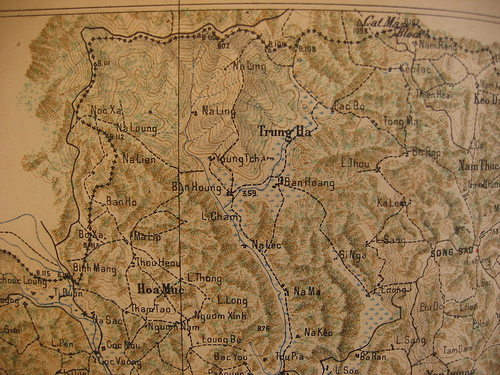 Một góc bản đồ tỉnh Cao Bằng SGI 1/100.100 năm 1948. Khu vực hang Pắc Bó kế cận các cột mốc 107, 108… thời Pháp-Thanh. Ảnh: (HN-MSS).