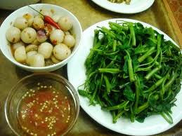 - Rau muống lại trở về vị trí nguyên thủy, truyền thống : Làm rău ghém. Luộc, chấm nước cắy, nước mắm, ăn với cà nén, cà dầm tương hoặc cà muối xổi chấm mắm tôm chanh (5). Nếu may mắn, có tiền mua thịt trâu đem xào tỏi!