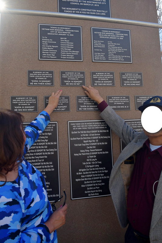 Một đài tưởng niệm Tử Sĩ Hoàng Sa được dựng lên tại khuôn viên Tượng đài Việt Mỹ tại Trung Tâm thành phố Westminster, được mệnh danh là thủ đô tị nạn. Trên bản đồ đài tưởng niệm có đầy đủ danh xưng các đảo đang tranh chấp, có tầm mức quan trọng về chiến lược biển như Hoàng Sa, Trường Sa.