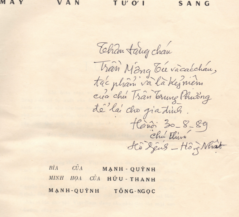 Chú Trần Trung Phương của tôi khi còn sống viết văn, làm báo cho thiếu nhi, hoạt động chống Pháp, bị bắt, tra tấn trong tù. Khi được thả ra thì ho lao chết ngày 24/7/1945. Lúc đó con trai mới 6 tháng tuổi. Thím Hồng Nhật, một người đàn bà có học, có nhan sắc, yêu văn chương, được tất cả các bạn văn của chồng kính nể. Mỗi năm làm giỗ chồng, thím mặc khăn áo đại tang làm giỗ, mời các bạn Văn/ Họa Sĩ của chồng như: Mạnh Quỳnh, Hữu Thanh, Tống Ngọc, Tam Lang, Khái Hưng v.v… đến dự. Ai cũng kính phục.