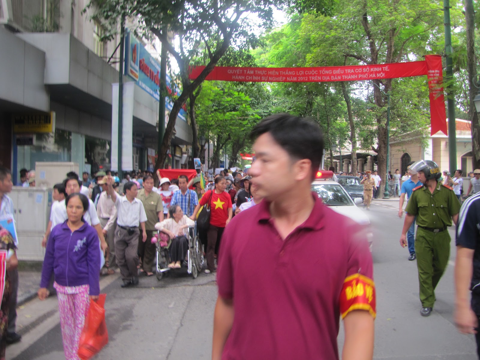 Đeo băng đỏ gây hấn với đoàn biểu tình, thái độ rất côn đồ.