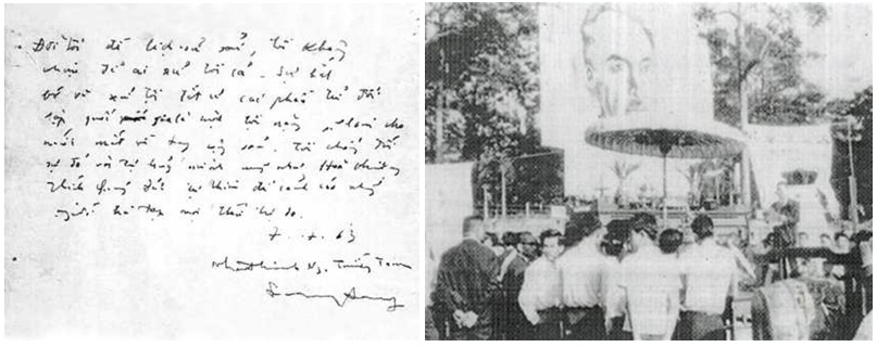 Gương mặt êm ả, bình thản. Để ý lắm mới thấy một ít nước bọt rỉ ra ở khóe mép… Thân thể ông mềm, trong túi có một tờ giấy, đó là Di ngôn. Ông đã viết hai bản di chúc, một để trong túi áo ngực, một tờ dặn đưa cho bác sĩ Đặng Văn Sung, nhờ ông ấy chuyển ra ngoại quốc.