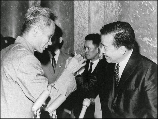 | Thủ tướng Việt Nam Phan Văn Đồng (Trái) nâng cốc chúc mừng Hoàng thân Norodom Sihanouk (P) trong chuyến thăm Hà Nội 26 tháng 5 năm 1970. |