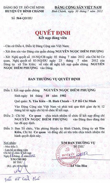 Nguyễn Chí Đức - Nguyễn Ngọc Diễm Phượng vừa báo tin cho tôi biết Chi bộ ĐCSVN nơi cô sinh hoạt đảng đã bỏ phiếu thống nhất xóa tên cô ra khỏi danh sách đảng viên
