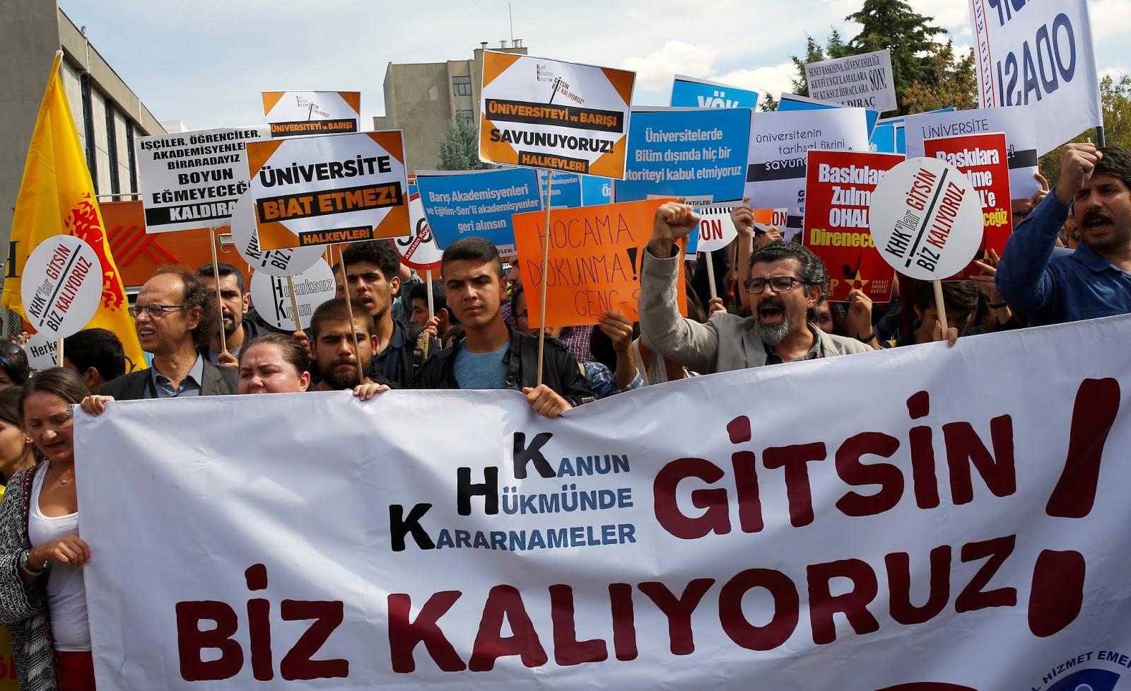 | Biểu tình phản đối đình chỉ công tác các giảng viên đại học tại Ankara, 22/09/2016. |