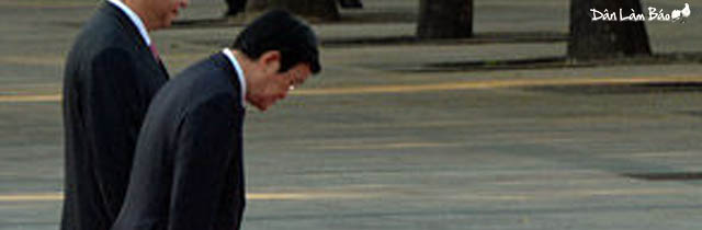 Nhưng, chú Tư Sâu ơi, làm sao mà “bước đi lên của dân tộc” cất được, khi hai cái chân “chết đứng như Từ Hải”, cái đầu thì gục xuống tựa muông chim, cái lưng thì cong khòm, như ngài chủ tịch nước CHXHCNCC khi đứng trước cờ đỏ năm sao vàng, một bên người đồng chức “vừa là đồng chí vừa là anh em” như thế này: