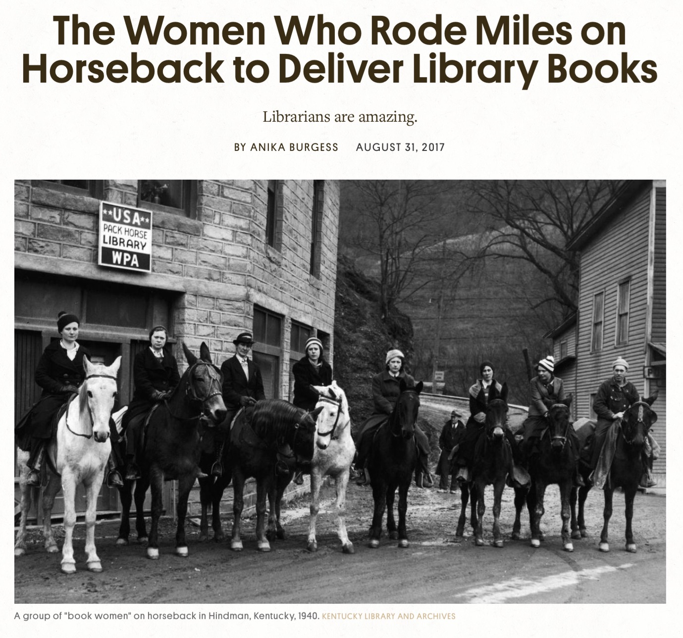 Tiếng vó ngựa lộc cộc gõ trên con đường toàn đá núi lởm chởm vọng vào tai khiến cậu bé Tom nhanh nhẹn ra phía trước nhà, mở toang cửa chạy ra. Cả gia đình cậu cùng chạy theo.Bà Mary nhẩy xuống khỏi lưng ngựa, thò tay vào trong cái túi vải vắt ngang lưng ngựa, lấy ra ba quyển sách nhi đồng và một tờ tạp chí đưa vào tay cậu. Tom lễ phép:- Cám ơn bà Mary, bà đã mang sách và tạp chí tới cho gia đình cháu. Chúng cháu thích lắm.Tom là cậu bé 10 tuổi, gia đình ở tận trên núi, biệt lập với xóm làng. Vào những ngày tuyết rơi, bà Mary vẫn một mình một ngựa mang sách của Thư Viện tới cho gia đình cậu. Đối với cậu những cuốn sách này ngon như những cái bánh cookies của mẹ làm.Hạnh phúc biết bao khi phải sống trong rừng mà được người mang sách tới nhà. Cả gia đình Tom được hưởng cái ân huệ từ “Bà sách” đáng yêu này.Giao sách tận nhà. Không rõ nămBà Mary và khá nhiều phụ nữ khác từ sáng tinh mơ đã yên đai chặt chẽ chở những túi sách trên lưng ngựa mang đến từng ngôi nhà trên núi, những ngôi nhà đơn lẻ trong những cộng đồng nhỏ bé cách biệt với thành phố.Không phải chỉ mình bà Mary mà là một đội ngũ Book Women “Các bà của sách báo”. Họ đóng sách vào những chiếc túi vắt ngang lưng ngựa và khởi hành từ bình minh, đi dọc theo sườn đồi tuyết, qua những thung lũng đầy bùn với mục đích giản dị là mang những sách báo tới những cộng đồng Kentucky biệt lập trên núi.Thư viện trên lưng ngựa là một sáng kiến của Tổng Thống Franklin Roosevelt thành lập để giúp nước Mỹ ra khỏi Cuộc Khủng Khoảng 1933 khi nạn thất nghiệp lên tới 40% ở Appalachia. Thư Viện trên lưng ngựa không phải là hoàn toàn mới mẻ với Kentucky nhưng đây là một cơ hội thúc đẩy nâng cao vừa về công việc cho nhân viên vừa về văn hóa.Bà Mary cũng như các bà của sách báo (Book Women) này đã cưỡi ngựa từ 100 tới 120 dặm Anh một tuần bằng chính ngựa hay lừa của họ trên những con đường đã được chỉ định, bất kể thời tiết xấu hay tốt. Nếu nơi tới quá khó khăn cho ngựa và lừa, họ không ngần ngại, nhẩy xuống và cuốc bộ. Bà Mary nhớ lại, có khi bà phải kêu gọi sự giúp đỡ của người địa phương quen thuộc hay cả một tay miền núi không tin cẩn được.Chiến dịch Thư Viện Trên Lưng Ngựa là một sáng kiến Hành Chánh Cấp Tiến (Work Progress Administration- WPA) của Tổng Thống Franklin Roosevelt để đưa nước Mỹ ra khỏi cơn đại suy thoái vào năm 1933, tỷ lệ thất nghiệp đã lên tới 40%. Thật ra Thư Viện trên lưng ngựa trước đây đã có rải rác ở Kentucky, nhưng sự thúc đẩy mạnh này giúp bớt được cả nạn thất nghiệp lẫn nạn mù chữ.Cuối năm 1938 có đến 274 Thủ Thư giao sách trên lưng ngựa qua 29 quận hạt. Tổng cộng có đến gần 1000 nhân viên thư viện cưỡi ngựa làm việc. Quỹ hết năm 1943, trong cùng năm đó, WPA đã xóa được nạn thất nghiệp trầm trọngsau thời chiến. Những năm kế tiếp, sách lưu hành ở khu vực này đã được tái lập, ngày càng được nhiều người yêu thích trên khắp đất nước.Ngoài việc cung cấp các tài liệu đọc sách, bà Mary cũng như các bà Thủ Thư đó, đã có công làm cho các cộng đồng kết hợp chặt chẽ thân thiện với nhau. Họ đã cố gắng cung cấp thêm về sách báo thiếu sót. Bà Mary nhớ lại niềm hạnh phúc lớn nhất của các bà là khi họ dừng lại để đọc những trang sách cho người mù chữ, và cũng chính họ đã giúp nuôi dưỡng niềm tự hào địa phương.Những người nhận được sách đã cảm kích công việc của những Thủ Thư trên lưng ngựa này. Có người đã thốt lên: "Những quyển sách mà các bà mang lại cho chúng tôi đã cứu đời sống chúng tôi."Nhu cầu đọc sách trông thấy rõ rệt. Thư viện Letcher County được thành lập. Người dân Mountain Eagle đã thể hiện sự mang ơn nồng nhiệt, họ nói trong xúc động: "Thư viện nằm trong cộng đồng và quận của chúng tôi, và ở đây để phục vụ chúng tôi ... Nhiệm vụ của chúng tôi là đến thăm thư viện và giúp đỡ tối đa, để chúng tôi có thể giữ nó như một điều tốt đẹp trong cộng đồng của chúng tôi."Bây giờ không còn Thủ Thư cưỡi ngựa đi giao sách ở vùng xa, vùng sâu nữa. Bà Mary chắc cũng qua đời rồi, nhưng hình ảnh những người đàn bà trên lưng ngựa vẫn có thể tìm thấy trong những trang sách nào đó trong các thư viện trên nước Mỹ. Đó là một hình ảnh vừa đẹp vừa làm rung động những trái tim người yêu sách.Thư viện lớn nhỏ đã ở khắp mọi tiểu bang trên nước Mỹ. Sách được gửi tới nhà, nếu cùng một quận hạt. Người ta tới Thư Viện không còn là một vấn đề khó khăn.Câu chuyện Thư Viện lưu động trên lưng ngựa này từ 1933. Cách đây cả hơn 80 năm đã cho chúng ta một liên tưởng gì với những ngôi trường bên kia sông ở những vùng xa, vùng sâu như mạn ngược Cao Bằng, Lào Cai… trên đất nước Việt Nam, ngay trong thời điểm văn minh của nhân loại ở thế kỷ này. N