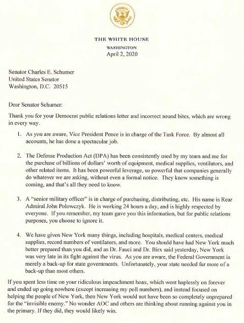Đây là lá thư ông Trump gửi lại cho Chuck Schumer sau khi Schumer gửi thư phàn nàn và chê bai tổng thống Trump về virus cúm Tàu. Nội dung bức thư này tạm dịch như sau.