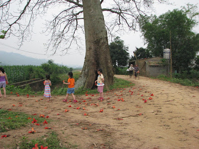 Bỏ qua mọi ưu phiền, lo lắng và toan tính thường nhật, cả bọn kéo nhau ra cây gạo ngoài bãi, tán gạo đầu làng, vòm gạo bên vệ đường làng, lướt chân trần trên cỏ, ngả lưng trên xào xạc lá ngô, cảm nhận màu sắc - hương vị - không gian hoa gạo và chùng mắt, mềm cười nhìn lũ trẻ tung tăng bên thân cây xù xì, giữa thảm hoa rơi đỏ rực.