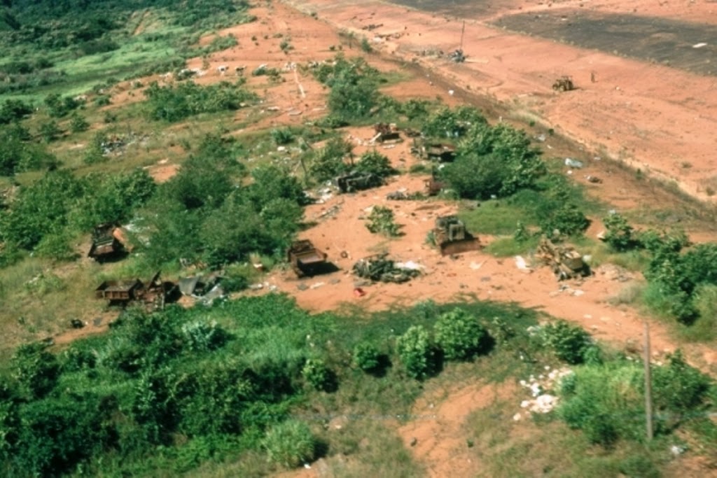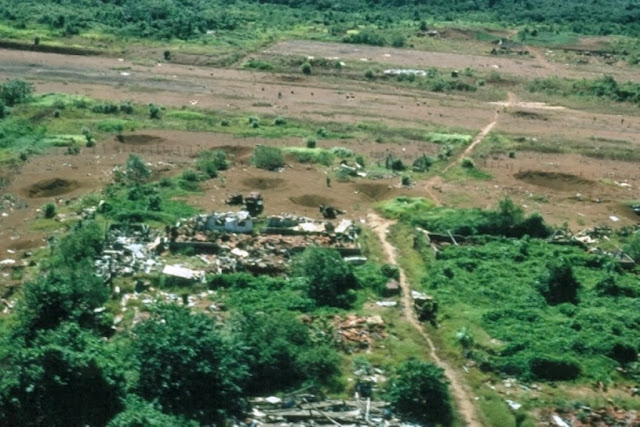 – Đây này, ngay chỗ này này, anh vừa phóng ra khỏi trực thăng thì một trái pháo rơi ở chỗ kia, anh phải nhào ngay xuống cái giao thông hào của Vi Xi đào sẵn nên mới toàn thây... VC vẫn còn đóng quân trên ngọn đồi kia kìa, khẩu đại liên từ đó nã đạn xuống đây ào ào, súng vẫn còn vang vọng chát chúa từ khu rừng trước mặt, bom nổ ầm ầm ngay sườn núi đó...