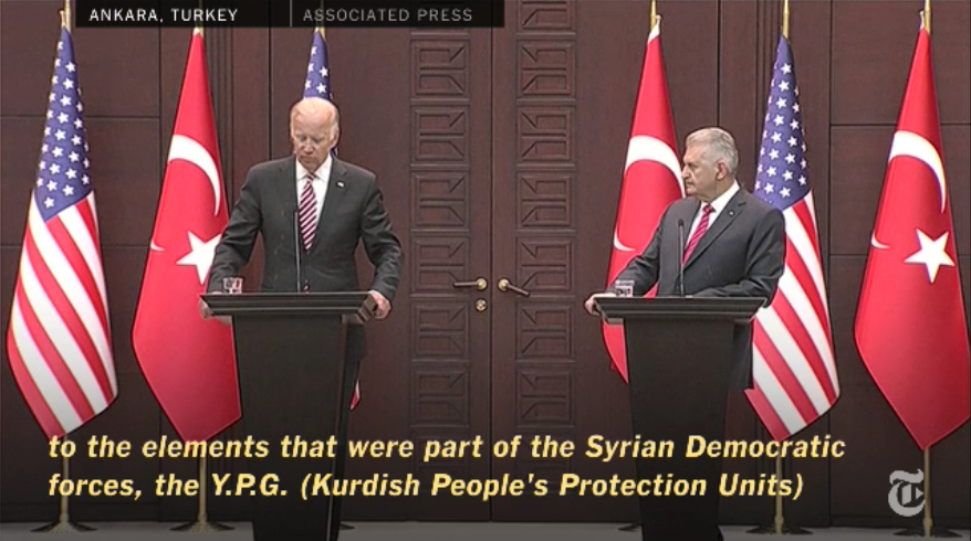 | Phó TT Mỹ Joe Biden (trái) và Thủ tướng Thổ Nhĩ Kỳ thỏa thuận vụ hành quân qua Syria và vấn đề Syrian Kurdish |