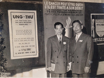 Hình 3: Gs Phạm Biểu Tâm (trái) và Bs chuyên khoa Ung thư Nguyễn Xuân Chữ đi dự Tuần lễ Ung Thư / Semaine Du Cancer (1950) tại Pháp, phía sau là tấm poster tiếng Việt với slogan: Ung thư càng để lâu bao nhiêu càng kém hy vọng khỏi bấy nhiêu. Hãy đến khám tại Cơ quan Trung ương Việt Nam Trừ Ung thư tại Bệnh Viện Yersin Hà Nội. [nguồn: hình tư liệu gia đình Gs Phạm Biểu Tâm]
