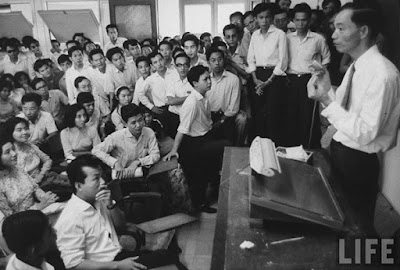 Hình 11: Gs Phạm Biểu Tâm nói chuyện với SVYK trong một giảng đường 28 Trần Quý Cáp, Sàigòn sau vụ Thầy bị bắt trước biến cố 1963 [nguồn: Life Magazine]