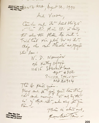[2] Santa Ana 12-8-1990. Anh Vinh, cảm ơn anh đã dành thì giờ và tìm đến thăm tôi và cũng để cho tôi thăm lại anh. Trước hết xin phép trả nợ đã. Chép cho anh địa chỉ anh Nguyên như sau: