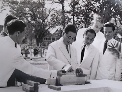 Hình 8a: Lễ đặt viên đá đầu tiên (1962) xây cất Trung Tâm Giáo Dục Y Khoa tại đường Hồng Bàng, Chợ Lớn; từ trái: Gs Khoa Trưởng Phạm Biểu Tâm, Tổng Thống Ngô Đình Diệm, Gs Nguyễn Quang Trình, Gs Lê Văn Thới; đứng phía sau là Đại sứ Mỹ Frederick E. Nolting, Jr.