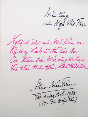 Hình 13: Bài thơ với thủ bút của Gs Phạm Biểu Tâm tặng Kiến trúc sư Ngô Viết Thụ (1975), Giải Khôi nguyên La Mã, người thiết kế Dinh Độc Lập và Trung Tâm Giáo Dục Y Khoa (1962) trên đường Hồng Bàng, Chợ Lớn. [nguồn: hình tư liệu gia đình Gs Phạm Biểu Tâm]