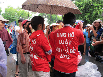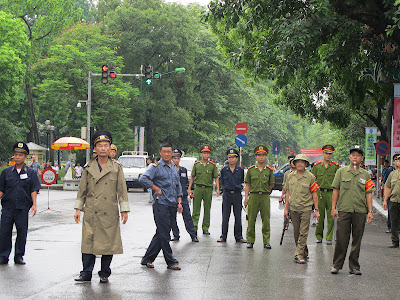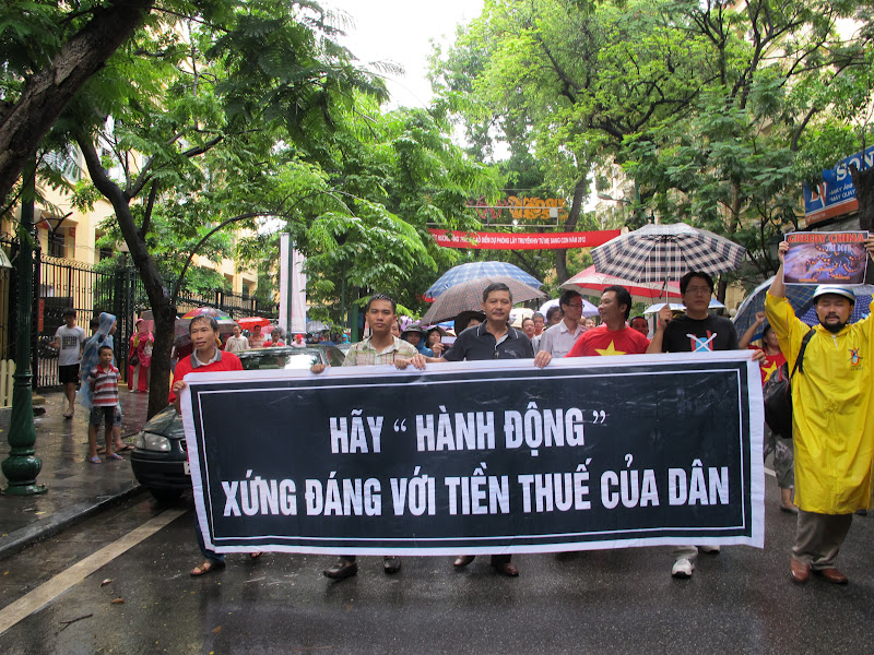 Đi thôi…Thế là đoàn người dắt díu nhau đi…Từ bờ Hồ, thẳng đường hàng Khay, Tràng Thi, qua ngã tư Cửa Nam, tiến vào Điện Biên Phủ. Tới đó thì bị chặn lại. Đối diện qua vườn hoa Canh nông là nơi “bất khả xâm phạm”. Đành đứng lại ngã tư Điện Biên Phủ-Trần Phú. Loa cảnh sát cũng tố hành động ngang ngược gần đây của Trung Quốc, Đảng, Chính phủ đang tính toán và giải quyết việc này, bà con nên giải tán về, không nên tụ tập gây mất trật tự công cộng…Vẫn là thế xưa nay, không lạ. Đoàn người lại quay về hướng Bờ Hồ, tới chân tượng Cảm tử quân. Bề ngoài đơn giản là vậy. Nhưng tâm tư mỗi người mỗi khác.