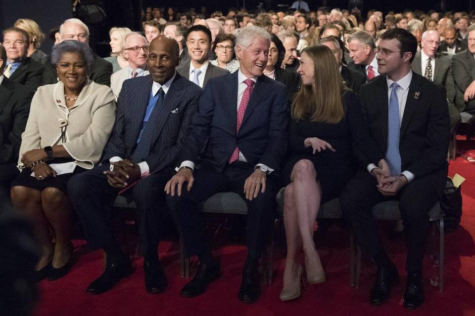 | Cựu Tổng thống Bill Clinton và con gái Chelsea Clinton và con rễ Marc Mezvinsky(phải) đang ngồi chờ nghe vợ ông tranh luận lần đầu với ứng cử viên Cộng Hòa Donald Trump |