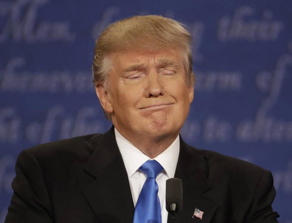Donal Trump đại diện đảng Cộng Hòa mặt mày nhăn nhó đứng bên cạnh bông hoa tươi cười